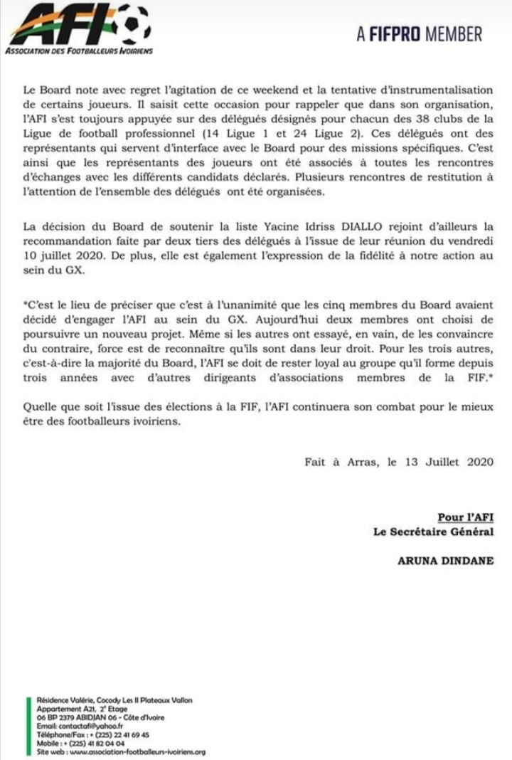 Le Board (Comité Directeur) de l'Association des Footballeurs Ivoiriens (AFI), s'est réuni ce jour, lundi 13 juillet 2020 par visioconférence, pour analyser l'actualité du football national, en cette période de pandémie de la COVID-19. L'AFI note avec amertume qu'alors que l'opinion est passionnée par la bataille électorale en cours pour la présidence de la fédération ivoirienne de football, le footballeur ivoirien fait face à la cessation brusque de son activité professionnelle. A ce jour, l'AFI est la seule organisation qui, grâce à ses partenaires, a apporté une aide directe à tous les footballeurs. Quoique louable, cette action est encore loin de constituer une solution durable à la problématique du statut social du footballeur ivoirien. Pour preuve, c'est avec consternation que le Board a appris la mort subite d'un joueur du Club d'Agboville, la semaine passée. C'est le lieu d'en appeler à la fédération et à toutes les bonnes volontés pour qu'une aide soit apportée aux footballeurs en cette période de COVID-19.